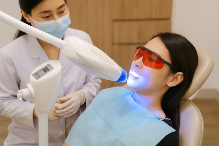 Thực hiện tẩy trắng: Sử dụng gel tẩy trắng chuyên dụng kết hợp công nghệ đèn Laser/Zoom để tăng hiệu quả.